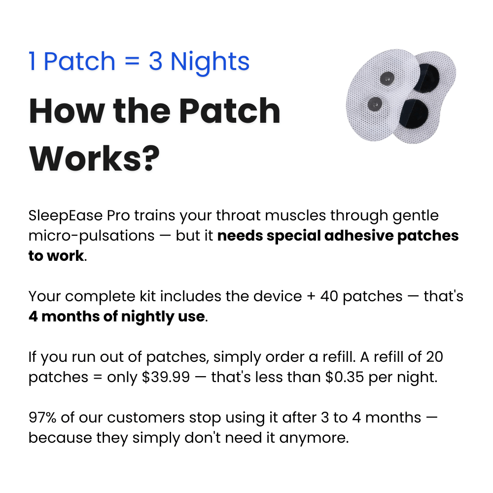 Your SleepEase Pro Complete Program includes a full 4-month supply to achieve permanent muscle retraining. However, some customers prefer to keep extra patches on hand for: